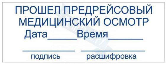 - Штамп ПРОШЕЛ ПРЕДРЕЙСОВЫЙ МЕДИЦИНСКИЙ ОСМОТР ВРЕМЯ ПОДПИСЬ на автоматической оснастке Trodat 3912 размером 47 х 18мм по цене 1198 рублей и еще 84 вида штампов со стандартными словами